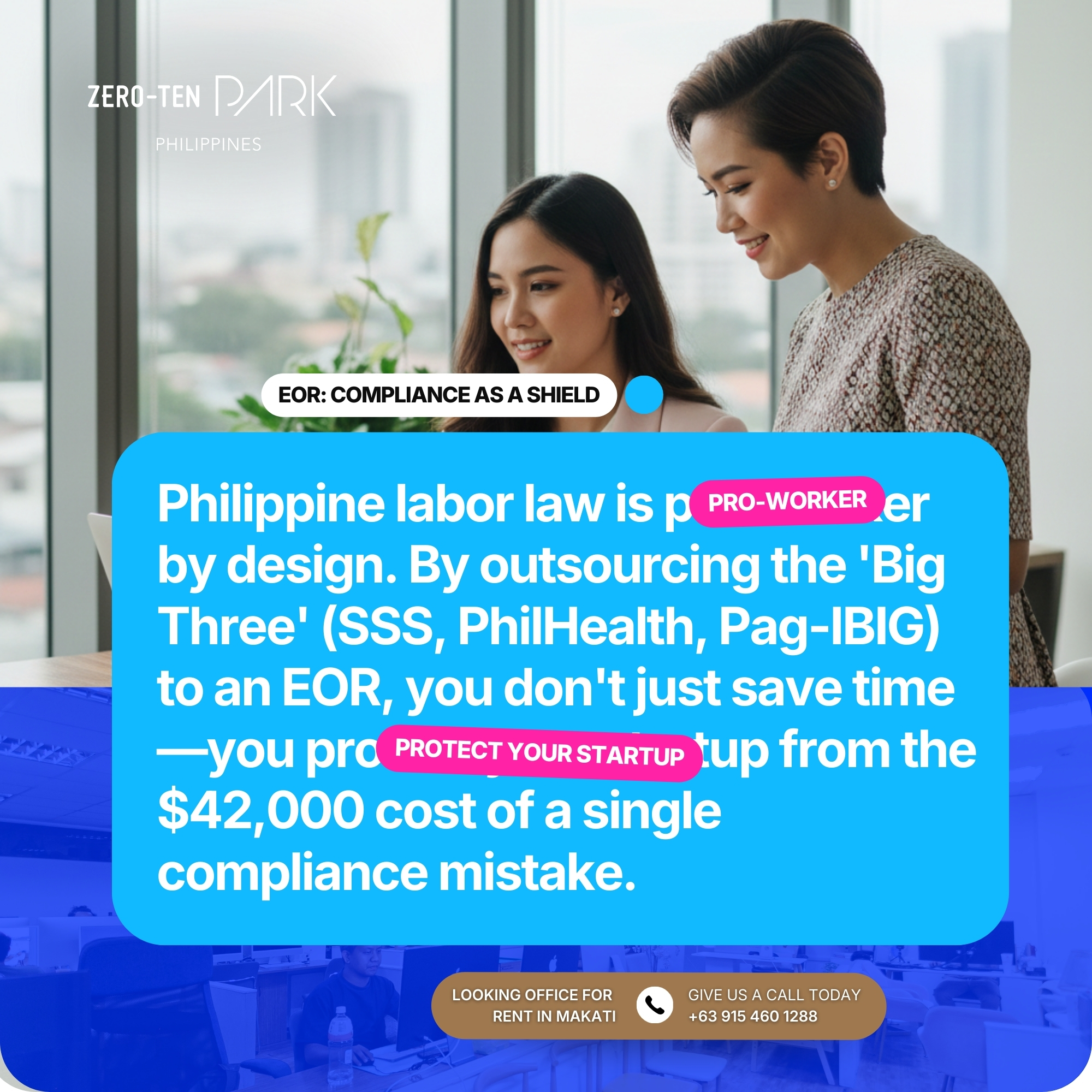 At Zero-Ten Park, we specialize in providing a “soft landing” for founders scaling in the Philippines. Beyond our premium workspace in Makati, our integrated Employer of Record in the Philippines service removes the bureaucratic friction of international expansion, allowing you to hire and onboard local talent in a matter of days. We handle the complexities of Labor Code compliance, 13th-month pay, and 2026 statutory contributions so you can focus on moving your business from zero to ten.